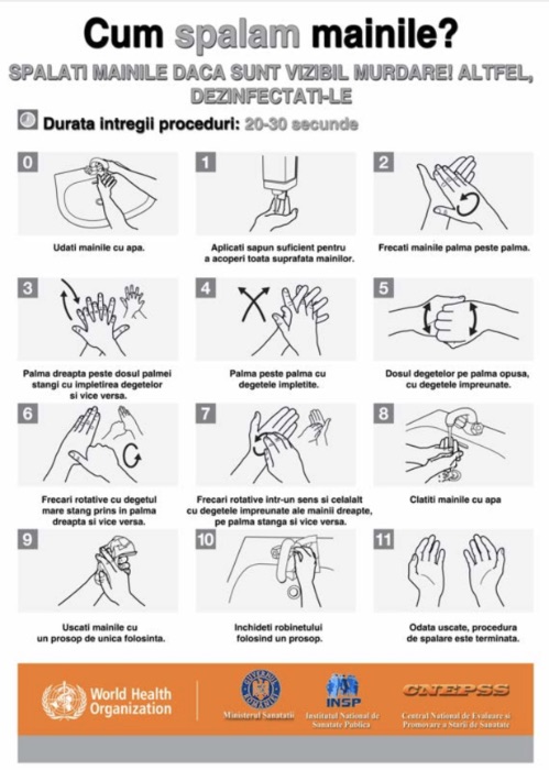 Spală-te des pe mâini cu apă și săpun timp de cel puțin 20 de secunde, mai ales după ce ai fost într-un loc public sau după ce îți sufli nasul, tușești sau strănuți. (pentru a te șterge pe mâini folosește, de preferat, prosoape de hârtie). Dacă nu sunt disponibile apa și săpunul, utilizează un produs de dezinfectare a mâinilor. Acoperă cu lichidul toată suprafața mâinilor și freacă-ți mâinile până când se simt uscate. |